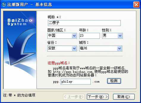 提示:百兆域名是以http://ppp代替http://www的一套全新的一级域名,在“注册PPP域名”项目中所要注册的名称即为个人电台域名,用户可以自由发挥,为吸引浏览用户可抢注一些有个性的域名。注册时,可以先利用系统的“检测”功能来查看要使用的域名是否被占用。当然,你也可以在登录百兆后再申请。