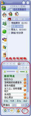新版MyIM最大的亮点便是可以打造属于你自己的在线音乐平台,它拥有高达100万首歌曲海量音乐库,以及3500GB的容量,并且官方宣称将以每天500首MP3打擂歌的速度不断更新,还附加有“轻松办公”、“运动的旋律”等各类主题式列表,另外,强大的列表编辑还可以将你硬盘上的歌曲收录其中,真正让你享受边聊边听的乐趣(见图)。