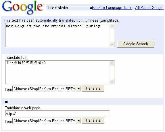 界面中突出显示了两个大大的文本输入框,第一个(This text has been automatically translated from….)就是翻译结果的显示文本框,底下一个(Translate text)就是原文输入框了。使用时,在“Translate text”文本框中输入待翻译的字词或句子,然后在“from”下拉框中选择一种翻译方式。例如要想将简体中文翻译成英语就选择“Chinese(Simplified)to English BETA”,然后单击翻译执行按钮“Translate”即可(见图)。是不是比你查阅厚厚的词典要方便得多?而且句法、语法都有了。下面我们再来看看它是如何完成整个网页的翻译工作的。