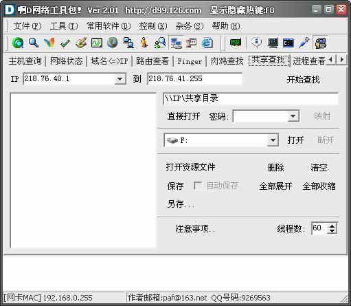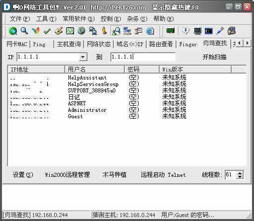 粗心的左左,竟然不用防火墙关闭自己的139端口。按下“Ctrl+0”切换到“肉鸡查找”,填入从“1.1.1.1”到“1.1.1.1”,点击开始扫描,啊D网络工具开始依据自带的字典猜测用户名密码(图2)。