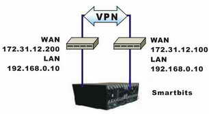 这个测试的结果表示被测产品的最高VPN隧道传输速度。测试方法如图5所示,我们将两个同型号设备的LAN端口都连接在Smartbits的相应端口上,然后在这两个设备之间建立一条加密的VPN隧道,接下来运行Smartbits,它会发出一系列的数据包,从而进行速度测试。