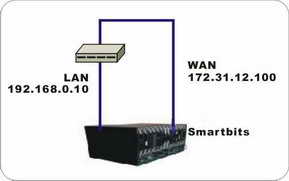 这个测试是在没有VPN隧道的前提下进行的,主要是针对VPN的路由器数据包转发速度测试。测试方法如图6所示。我们将一台路由器的WAN端口和LAN端口分别连接到Smartbits的相应端口上,然后运行Smartbits,它会发出一系列数据包穿过路由器的防火墙进行测试。