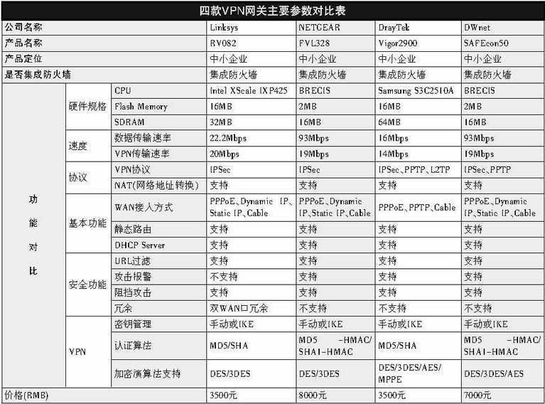 通过以上几项对VPN网关性能影响较大的参数对比,我们可以发现RV082拥有较好的稳定性,作为VPN网关,这是其他三类产品无法比拟的优势;而FVL328和SAFEcon50则拥有较高的传输速度;在VPN功能和安全性方面,SAFEcon50又与Vigor 2900一样拥有不凡的表现。所以相比之下,Linksys的RV082和DWnet的SAFEcon50在这四款产品中性价比更为突出(四款VPN网关主要参数对照见下表)。