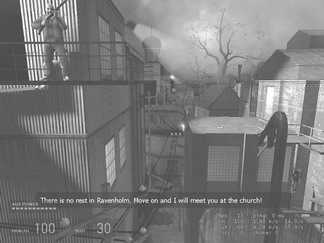 好半天我才在一条狭窄的小巷深处的楼顶与他会合。不过当我正等待他在另一头用绳索把我运过去时,突然不断从四面八方扑过来无数的变种怪物,好在敌人的数量还不是很多,可以轻松应付。不多一会,男子把滑车滑过来,我拉动开关跳上车,到达了铁栅栏的另一头。再次交谈我才获悉,原来这位男子是当地教堂的一名传教士。他说这座城市已经被外星生物侵袭好久了,整个城市的居民现在只有他一个人幸存下来。正说着,后面又冲上来新的一群怪物,我和传教士互相协助,边打边退,一直退到了墓地一道门前。传教士帮我拉开栅栏门,让我从下面钻了过去,而他却因为被敌人团团围住而无法脱身。没办法,即使我想帮他也没有可能了。眼看着传教士的遭遇,我心中思绪万千,带着强烈的复仇使命感,我忍痛继续前行。进入了一个废旧矿坑。废旧矿坑里仍是不断有大量的敌人,我在慌乱中寻找出路,又意外发现了一条坑道。顺着坑道一路小跑,终于摆脱怪物的纠缠。此时天已放亮,隐约可以看到一缕曙光,看着这风景,我才长长地舒了一口气……