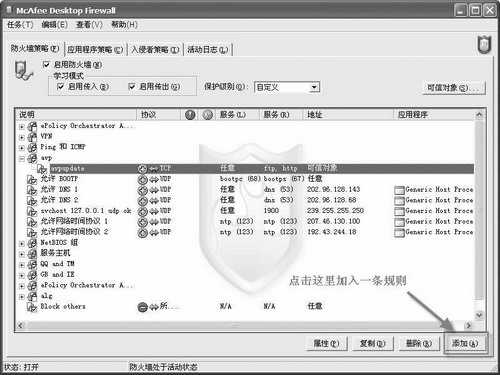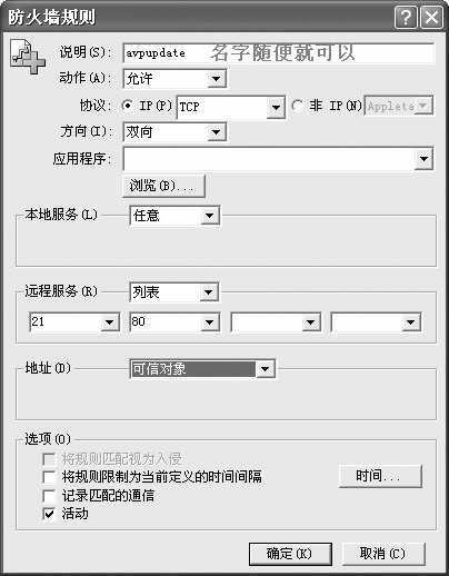 如图1所示,打开MDF的用户界面,点击右下角的“添加”按钮,在图2所示的“防火墙规则”窗口中新建一条规则。注意除了“说明”中的文字可任意输入外,其他选项的设置请参考图示。然后将AVP的升级服务器的IP地址添加到“可信对象”中就可以了,或者也可以将AVP升级服务器的IP范围添加到“可信网络”中,这样更可靠一些。