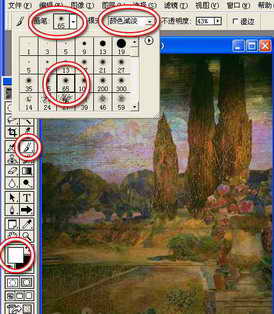 1.在Photoshop中打开一幅比较暗的油画作品。在工具面板中设置前景色为白色,选择画笔工具,然后在属性面板中设置画笔的笔头大小为65的虚边笔头,模式设置“颜色减淡”模式(图1)。