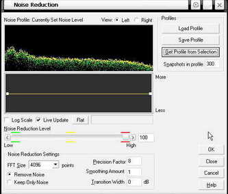 在得到噪音的特征信息后,选择Save Profile将分析结果保存为一个文件。关闭对话框后,选择文件中含有噪音的音乐部分,再次打开Noise Reduction对话框,用Load Profile将刚才保存的参数读出来,最后按下OK键即可。现在来听听降噪后的效果吧,是否令你大吃一惊呢?原来的噪音都销声匿迹了!真是太神奇了。