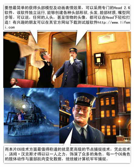 今天我们的CG主角为《极地特快》,该片运用“动作捕捉”技术对汤姆·汉克斯的表演进行了处理,使他一个人饰演了5个角色,并使该片成为第一部既是真人片又是动画片的电影。美国电影界评论说:一场电影科技革命由此开始了。