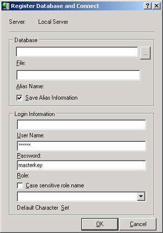 大家都知道要打开IB数据库,首先应该注册数据库(本地的或者是远程的),在随后出现的“注册数据库连接的设置框”中设置相关信息,界面如下: