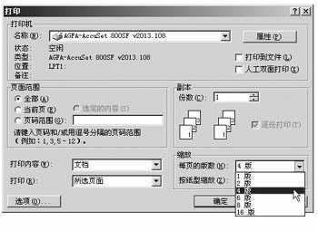 单击“文件”菜单中的“打印”命令,在“显示比例”下的“每页的版数”框中,单击所需选项,比如要在一张纸上打印一篇四页的文档,可以选择“4版”选项(图1)。