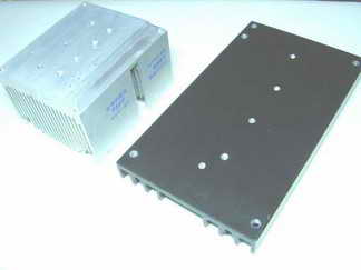 步骤2:接下来取出已经钻好了固定孔的大型散热片(图5),这里使用一个CPU散热片为发热量较大的肖特基管散热,黑色薄型散热片用于开关管散热。我们要将功率元件用螺丝固定在散热片上,功率元件与散热片之间用绝缘片隔开。有条件的话,最好用导热性能更好的云母绝缘片代替原配的绝缘片,在功率元件、绝缘片、散热片间涂上导热硅脂可达到最佳散热效果(图6)。
