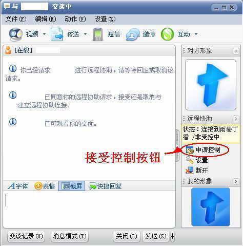 接下来,让他演示一下所出现的问题。看着对方慢悠悠的操作,真让人心急,于是就想获得直接的控制权。在远程桌面窗口中看到对方和自己的聊天界面右侧有一个“申请控制”按钮(图1),让对方点击它。接受后,调出远程桌面,发现鼠标可以使用了,只是速度有点慢,可能是网速的原因吧?总算可以“自由”操作对方的计算机了,目前要做的就是给网络减负,这样的速度怎么可以忍受?
