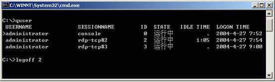 使用终端服务的很多用户可能会问一个问题,如果黑客连接上了我们的终端服务器,我们要如何才能查看到终端服务器当前已登录的用户呢?其实方法非常简单,用户只需要选择“开始”菜单中的“运行”命令,输入“cmd”打开命令行控制台。在其中键入query user ( 意为查询用户,也可以简写为quser),便可以查看当前终端服务器中的用户列表(图3)。大家可以从图3中看到,有哪些用户登录。其中带“console”是终端服务器的本地用户,其余的都是远程连接。如果在这个列表中发现了可疑的连接。管理员可以根据这个连接的ID号,断开这个连接。就是我们常说的“踢”人,只需要键入logoff ID (如断开连接2,键入logoff 2)即可 。