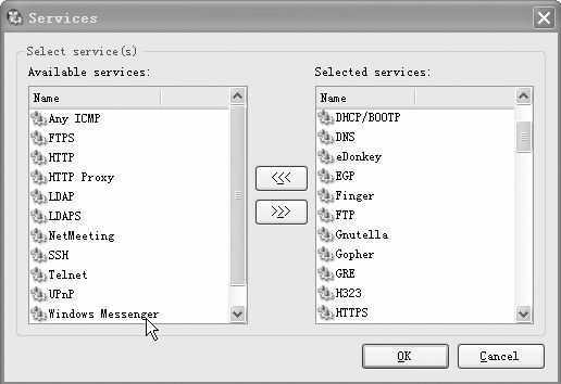 为了满足小胖的要求,果冻选中“Allow only predefined services”选项,然后点击“Services”按钮,弹出“Services”设置对话框(图2),设置同事们能够进行的操作。这时,果冻只需要将允许的操作选项添加到左侧的“Available Services”框体中即可。完成以上设置后,在“P2P Eliminator”标签页中,点击下方的“Apply”按钮,就可启用“P2P终结者”功能。禁用“P2P终结者”功能同样简单,取消对“Block Peer to Peer networks when detected”选项的选择,点击“Apply”按钮后即可。