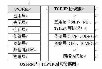 与OSI/RM相对应,互联网中普遍采用的TCP/IP协议簇,也划分为若干层,并与OSI/RM的层次结构相对应,这也就有利于网管对TCP/IP网络进行故障排查。TCP/IP协议簇分为应用层、传输层、互联层、网络接口层。它和OSI/RM的对应关系如表所示。
