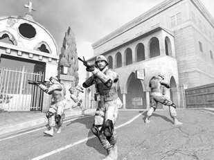 前面已经说过玩家在游戏中扮演的是带领三名下属共同作战的小队长,因此整个游戏的类型并非单枪匹马杀进敌群的FPS,而是类似于《彩虹六号》和《全光谱战士》一样的团队型射击游戏。不同之处在于《近距离作战:先发制人》中玩家只能控制队长本身,其他三名士兵的行动则由队长下达的指令以及电脑的AI配合来完成,因此熟悉Destineer在游戏中设计的RTFA战斗策略就非常重要了。