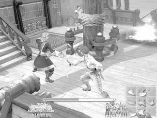 《大海盗!》的甲板战是这个游戏最为精彩的部分,更多的动作游戏成分加入其中,上、中、下三段攻击加上防守、跳跃、俯身、挑衅这些动作组合构成了《大海盗!》的单挑系统。虽然大部分甲板战可以凭借水手数量取胜。但是结婚典礼和最终BOSS之战只能靠自己的剑术,所以大家还是多加练习才好。