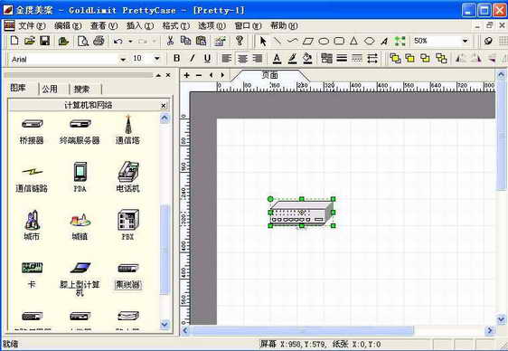 Step2:添加图标。工作界面分为两部分:左边是绘图需要用到的资源:图标、页面背景、边框等,右边是绘图区域。根据需要调整页面比例(笔者在这里选择为50%)。接下来向绘图区添加内容。笔者需要添加的第一个图标是集线器,只要在左边图库区域选中“集线器”图标后,用鼠标左键拖到右边绘图区合适的位置即可(图2)。