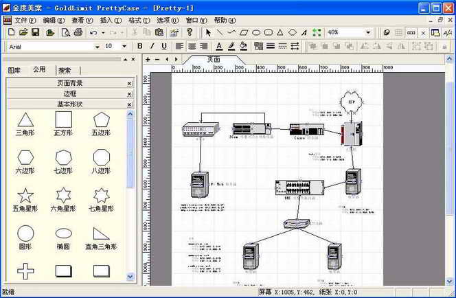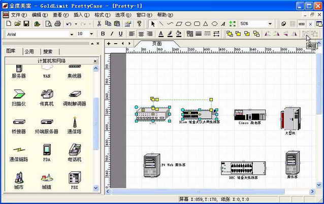 Step3:添加连线。所有需要的图标添加完毕后,我们需要画设备之间的连接线。可以通过工具栏上的线型按钮来绘制连接线,也可以继续使用图库中提供的连接线来完成连线操作:单击左边图标面板中的“公用”选项卡,然后在下面的列表中找到合作的连线并将它拖到工作区中,然后再通过鼠标调整它的形状及方向即可(图3)。