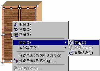 但是不要高兴得太早,这样用单个图形拼成的大衣柜是不方便移动的,我们需要把它组合起来。分别选中大衣柜主体、两扇柜门、两个把手,单击鼠标右键,选择“组合→组合”,如图5所示。组合完成后,大衣柜的各个图形成为一个整体,可以随意移动位置了。