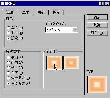 Step3:最后是两个圆形把手,在门上绘制一个圆形,选择填充效果里的“过渡→麦浪滚滚→中心辐射→变形1”(图4),确定后发现把手没有突浮的效果,这里我对它使用了三维效果中的“三维样式11”可以适当调整三维深度,将“72磅”改为“36磅”。通过复制、粘贴的方法将另一把手移动到另一扇柜门上,大衣柜的效果图就完成了。