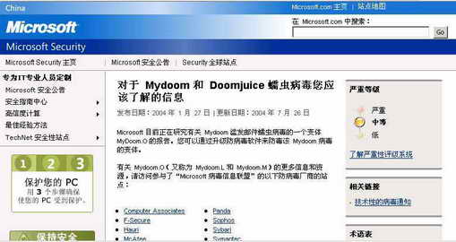 立即用笔记本电脑上网查询Mydoom的资料,连微软网站都将它列为危险病毒(微软相关网址:http://www.microsoft.com/china/security/incident/Mydoom.asp)(图2)。