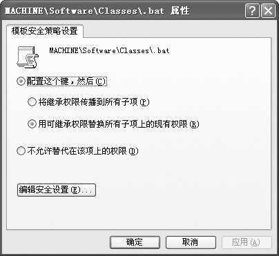 ②在出现的“模板安全策略设置”窗口中有两个选项,其中“向所有子文件夹和文件传播继承权限”表示该文件夹的子文件夹和文件都被重新配置并全部继承新的权限;“替换所有带继承权限的子文件夹和文件上的现存权限”表示不管那些子文件夹是否具备允许继承权限,都将会被应用新的权限,并且会从被配置的键继承新的权限。按需要任选一项,然后点击“编辑安全设置”按钮,如图5所示。