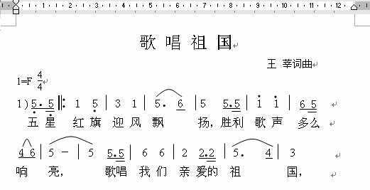 对音乐爱好者来说,有时会希望自己能在计算机上制作出工整的简谱。Word虽然是文字处理软件,但用其制作的简谱,完全可以和专业的简谱编辑软件相媲美。图2是笔者制作的《歌唱祖国》的简谱局部,自己来试一下吧!