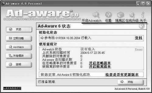 Ad-aware(http://www.lavasoft.de/,简体中文语言包:http:[LL]//cpcw.mydown.com)是一款很小的系统安全工具,它可以扫描你计算机中的网站所发送进来的广告跟踪文件和相关文件,并且能够安全地将它们删除掉。使你不会因为它们而泄露自己的隐私和数据。