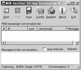运行MSN Sniffer,选择主菜单上的“Start”按钮,即可开始嗅探。在“MSN messenger conversation list”窗口中我们可以看到局域网所有机器的IP地址、端口、账号等等信息,选中要窥探的电脑,此时将在“Messages in the conversation”窗口中显示该计算机上所有的聊天信息。