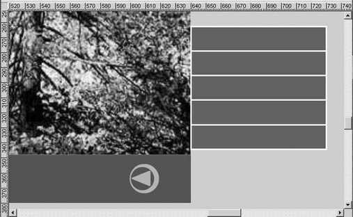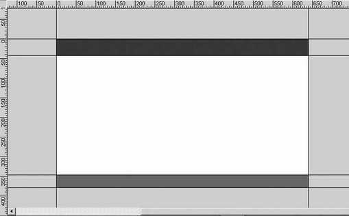⑤按下“CtrL+Shift+Alt+R”键调出标尺,拉出4条辅助线,2条水平,2条垂直,分别与舞台边缘贴齐;再拉出另2条水平辅助线,划分出标题区与导航栏。