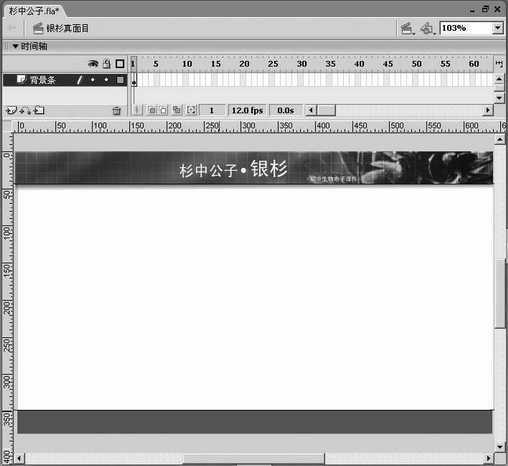 ③选择菜单“文件→导入→导入到舞台”,将1.jpg文件导入,放置在标题条的位置。原标题条下作为构图分割的颜色条可以删除。