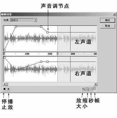 可以通过声音调节点来调节声音。它所在位置的高低就代表声音的大小,位置越高,音量越大,反之亦然。还可以单击调节线来增加调节点,拖动它,编辑线就随之变化,由此来控制和调节音量大小。如果想删除调节点时,只需要拖它出编辑区即可。