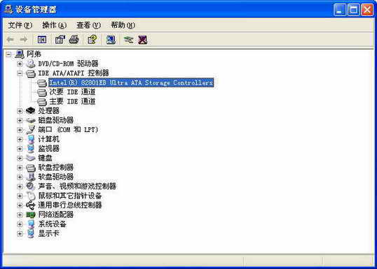 重新启动计算机后,右键点击“我的电脑”,选择“属性”命令,打开“系统特性”对话框。点击“硬件”选项卡,然后点击“设备管理器”按钮,以打开相应对话框。在设备管理器中可以检查驱动程序安装成功与否,点击“IDE ATA/ATAPI控制器”选项,可以看到“Intel(R) 82801DB……”选项,即表示安装成功,如图5所示。