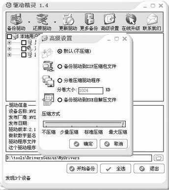 第一种是“默认(不压缩)”形式,即不对所备份的驱动进行压缩;第二种是“备份驱动到ZIP压缩包文件”,即可将所有备份的驱动程序制作成一个ZIP格式的压缩包文件,以减少占用的硬盘空间,但使用时需借助WinZip等工具软件;第三种则是“备份驱动到EXE自解压文件”,即将所有备份的驱动程序制作成一个EXE格式的自解压可执行文件,使用时无须WinZip等第三方工具软件。采用何种操作,使用者可自己酌情决定。