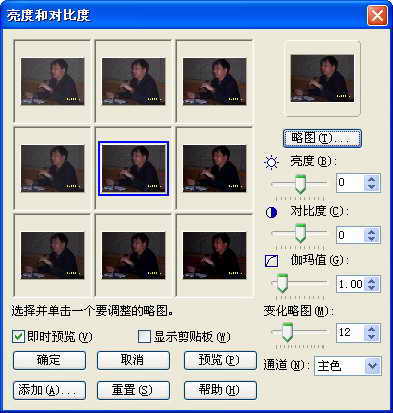 在“亮度和对比度”窗口中,显示有九个加工处理模式,如图2所示。分别从颜色光线由淡至深依次排列,如果需要加强颜色和光线可以单击相应的效果,然后自动应用;或者用户也可选取其中的一种,然后调节窗口右侧列出的亮度、对比度、伽玛值、变化略图等功能,进行必要的自定义设置,力求达到比较理想的效果。