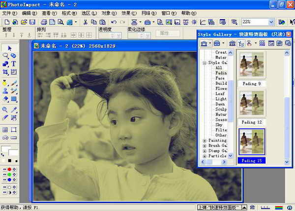 在PhotoImpact的“样式”命令中提供了相当多的色彩样式让你可以直接套用到要修补的照片上,在这里你无须进行任何复杂的编辑操作,只要找到你想要的色彩效果,直接套用就能迅速改变照片的色调与明亮度,非常方便。