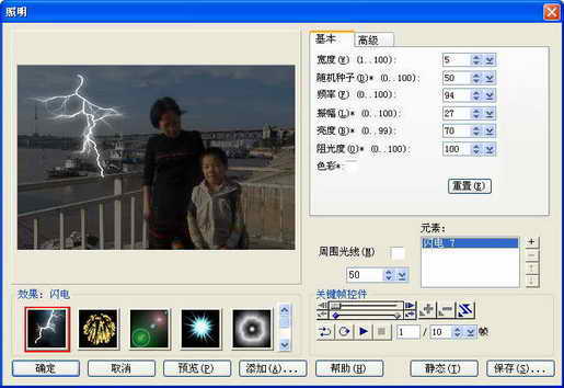 打开要处理的照片,然后单击“效果→照明→创意照明” 菜单命令,在打开的“创意照明”对话框中选择“闪电”图标,如图4所示。单击“元素”下的加号按钮可以增加闪电的数量,在缩图内拖动鼠标还可以移动闪电的位置,在右边的“基本”和“高级”参数区还可以修改其他的参数,设定完毕后单击“确定”按钮,在弹出的菜单中选择“将当前帧效果应用到图像”即可。我们可以看到照片立即多了闪电的特殊效果,很神奇吧!