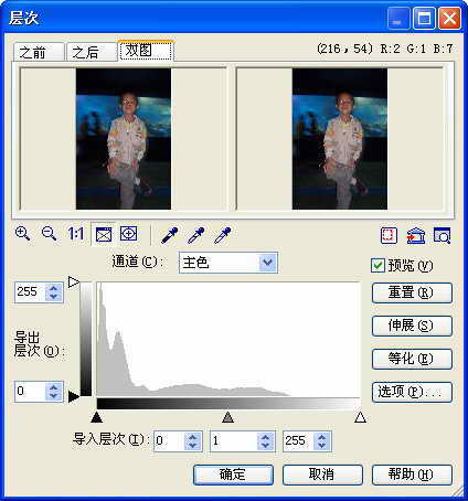 当你的相片不适用于自动处理时,我们可以改用更精确的手动调整功能来处理相片。打开偏蓝的相片,单击“格式→层次”菜单命令,在打开的“层次”对话框的“通道”中选择“主色”,然后单击上面最右边的吸管按钮,在左边的缩图中单击应该要为白色的位置,再单击上面最左边的吸管按钮,并在左边的缩图中单击应要为黑色的位置,这样就等于告诉PhotoImpact这张相片的白平衡该如何调整了。