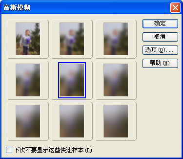 选取了背景物体后,然后依次单击“效果→模糊→高斯模糊” 菜单命令,弹出一个“高斯模糊”样式选取窗口,如图 6所示。在这个窗口中列出了9种不同程度的模糊样式,用户可根据自己的需要,选取不同的样式,然后单击窗口右侧的“选项”按钮。