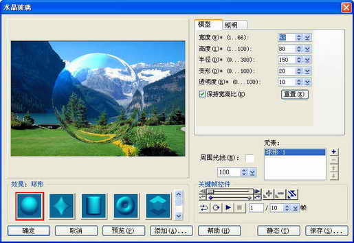 打开要处理的照片,然后单击“效果→材质→水晶玻璃” 菜单命令,出现“水晶玻璃”处理窗口,如图7所示。在下方的“效果”列表中选择“球体”图标,并在右边的参数设定栏中将“宽度”的数值调高一些,接着在照片缩图上用鼠标指针移动水晶球调整到你满意的位置。