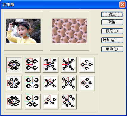打开要处理的照片,然后单击“效果→艺术→万花筒”菜单命令,打开“万花筒”对话框,如图8所示。程序内置了9个默认效果,我们可以直接选择想要的万花筒形式。如果对这几个效果不满意,还可以单击“选项”按钮,定义其他样式,先在出现的对话框下方选择万花筒的变化方式,并在左上方的预览缩图上移动鼠标指针将你要做万花筒变化的区域圈选起来,然后单击“确定”按钮即可。