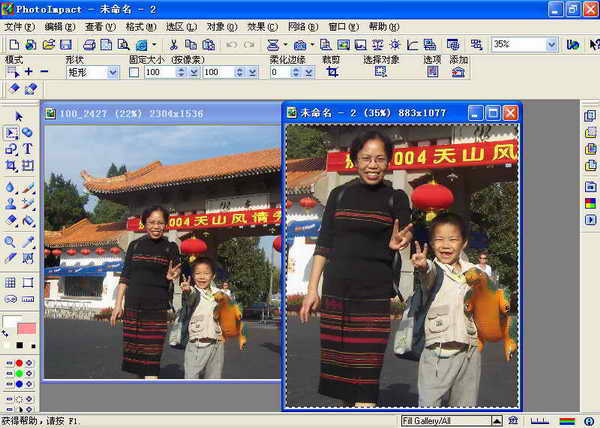 首先打开Photolmpact程序,然后将主体比较小的相片导入到编辑区域中,接下来在工具栏中选择一种选取工具,建议用户应用矩形选取工具,以便于得到矩形相片,只需在选取工具的“形状”属性下拉菜单中选择“矩形”形状就可以,然后通过鼠标在相片中选择所需的部分。