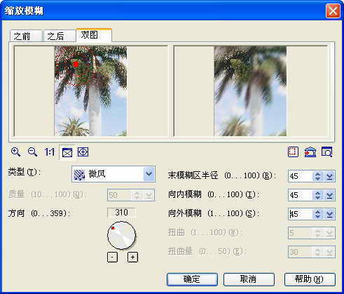 另外你也可以单击“选项”按钮自行调整参数,在出现的“焦距”对话框中,你可以看到修补前后的预览缩图,将鼠标指标移到画面下方的拉杆上,并移动拉杆调整照片的模糊或清晰度,然后单击“确定”完成修改。