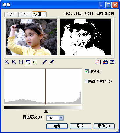 首先将要处理的照片打开,然后单击“格式→色调图”菜单命令,出现“色调图”对话框,如图19所示,可以看到修补前后的预览缩图,将鼠标指针移到画面左下角的曲线图上,并在该曲线上按住鼠标不放,拖曳曲线做色彩分布比例的调整,马上在画面右边的缩图中你就能看到调整后的效果,可以多试几次找出最满意的效果,单击“重置”按钮可以回到最原先的状态再做处理。