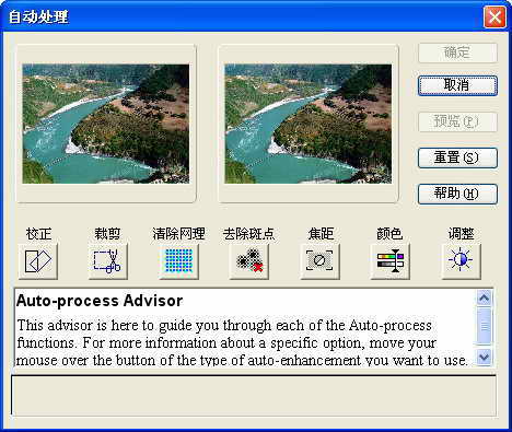 将要处理的照片打开,针对照片亮度不够、颜色太弱等多个问题,一次就能修补到位。单击“格式→自动处理→批处理”菜单命令,出现“自动处理”对话框,如图22所示,你可以看到去除斑点、清除网纹、颜色、焦距等七个修补相片的选项和修补前后的预览缩图,逐一单击你要进行修补的按钮,你可以在画面右方处理过后的预览缩图内看到修补的效果,最后单击“确定”按钮即可。