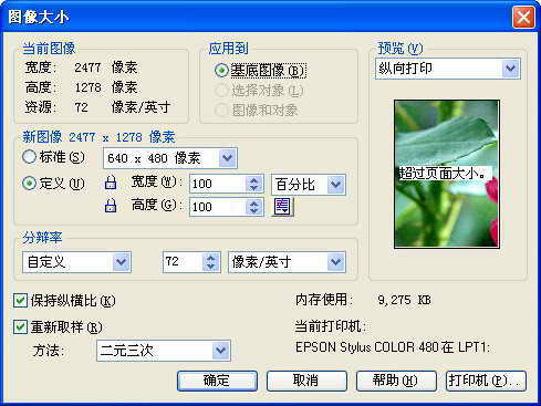 打开图片,单击“格式→图像大小”菜单命令,选中“定义”,然后就可以在后面的选项中自己设置图片的大小,如图23所示,也可以在“分辨率”中给图像设置新的分辨率,分辨率愈高,打印出来的图像愈小,分辨率愈低,打印出来的图像则愈大,设置完毕,最后单击“确定”按钮即可。