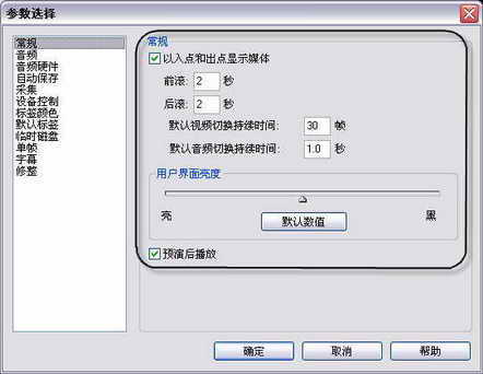 在参数选择窗口中,可以看到左边一栏中有常规、音频、音频硬件、自动保存和采集等参数设置选项。在“常规”选项中可以设置在出入点显示媒体素材的前滚和后滚时间以及默认的视频切换和音频切换持续时间。视频过渡切换默认的持续时间为30帧,音频过渡切换默认持续时间为1.00秒,我们可以根据自己的需要自行设置。另外Premiere Pro 1.5还有个人性化的选项,就是用户界面亮度调节,通过调节滑块可以调节Premiere Pro 1.5主界面的亮度。从这点可以看出这个软件还是非常体贴用户的。
