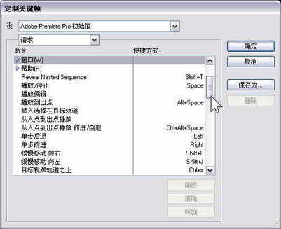 经过上面的设置,Premiere Pro 1.5的运行环境应该处于最佳的状态了。另外通过设置Premiere Pro 1.5的快捷键,可以大大提高其工作效率。单击Premiere Pro 1.5的菜单“编辑?定制键盘”菜单命令,弹出定制键盘窗口,如图3所示。