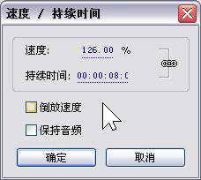 我们可以在上图中改变当前选中素材的速度或持续时间,右边一个链条是用来使速度和持续时间关联的。选中“倒放速度”可以使素材变成倒序播放的效果,这也用在很多的特技效果中。选中“保持音频”是用来维持音频的音调,使其不随视频的播放速度变化而发生变化。